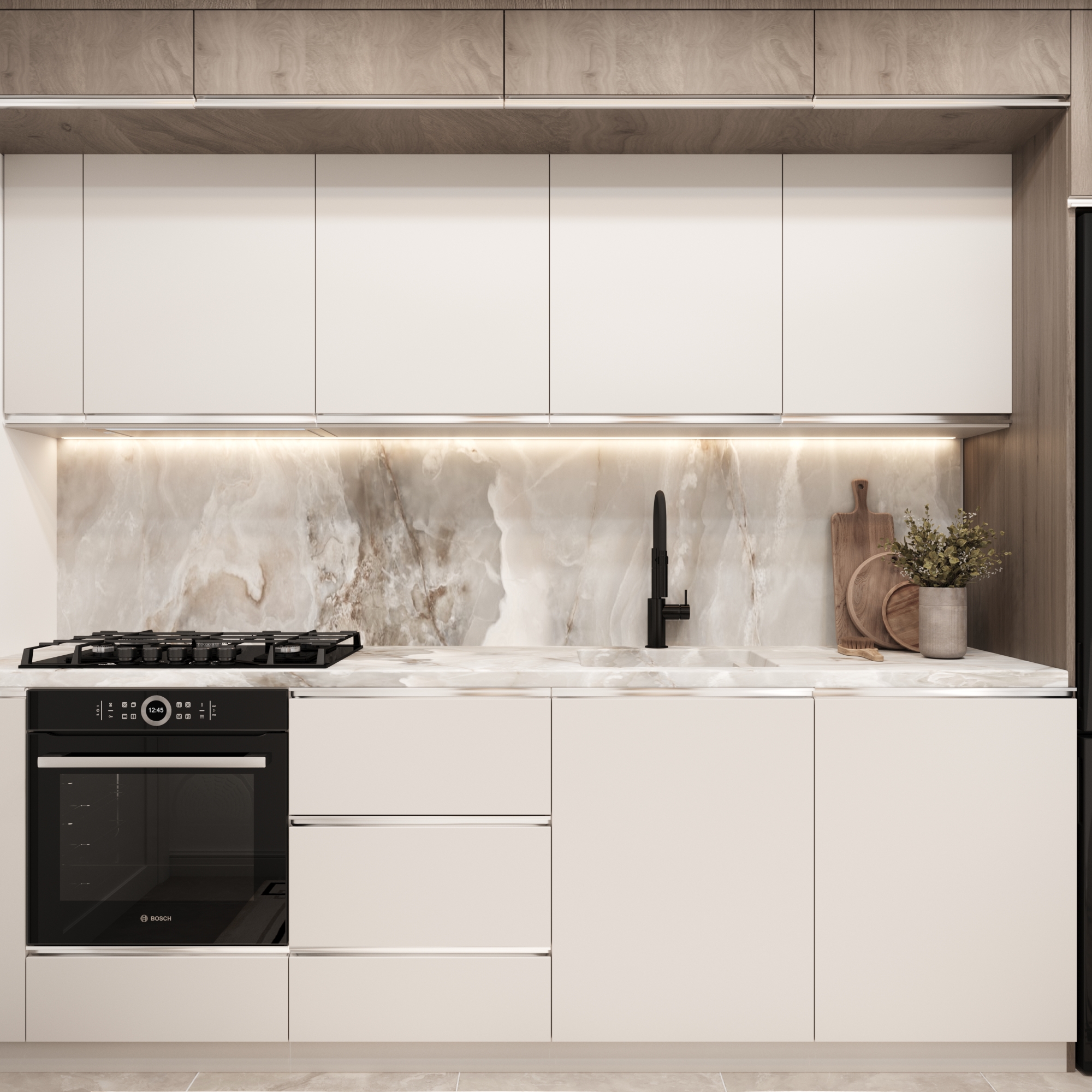 Interior Curation: Minimalist kitchens with veined marble; master bedrooms featuring dramatic, dark textured feature walls for a luxury feel.