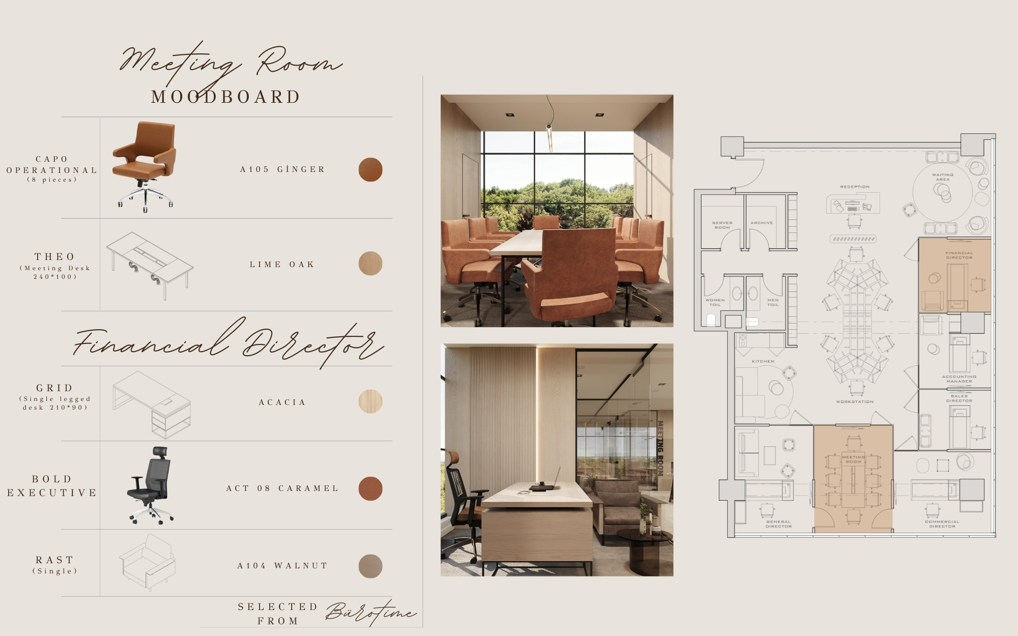 A modern office interior project featuring natural materials, soft neutral colors, open-space planning, and refined executive areas.